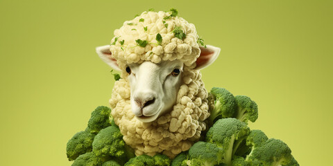 Cauliflower Sheep Surreal food mashup on white Playful vegetarian concept.