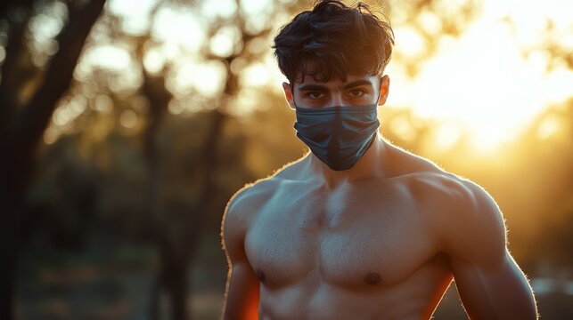Handsome young Hispanic man adjusting protective face mask during outdoor workout at sunset in nature with glowing sunlight and copyspace for text