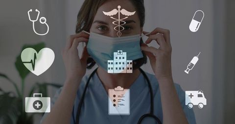 Female clinician adjusting surgical mask in clinic wearing stethoscope with medical icons