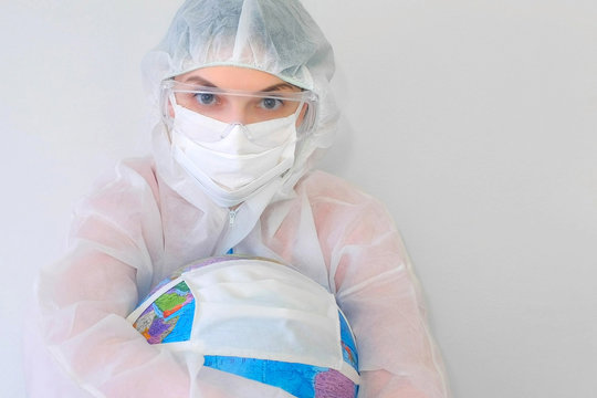 Portrait of woman doctor in protective suit, mask, glasses, gloves cuddling globe in mask on white background looking at camera. Coronavirus quarantine. COVID-19 epidemic, pandemic fighting concept.