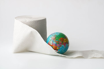Coronavirus. Covid 19. Earth and toilet roll on the white background