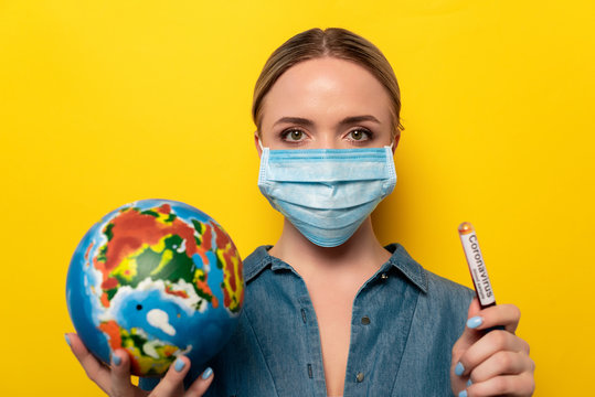 Woman holding a globe as a sign in an ecological protest. Activists wearing protective masks marching for the environment.
