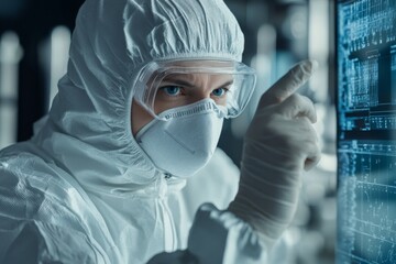 Research scientist in protective gear examines data on a digital display in a laboratory setting during nighttime