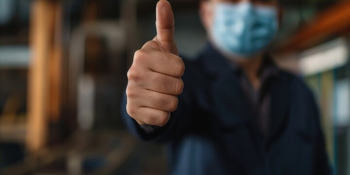 A close-up of a masked individual giving a thumbs up, showcasing positivity and resilience in the workplace during challenging times, highlighting the adaptability of workers.