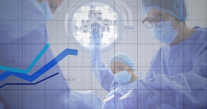 Surgeons performing surgery in modern operating room wearing sterile gowns and masks