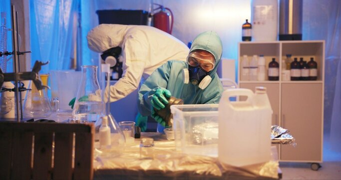 In the Underground Laboratory Two Clandestine Chemists Wearing Protective Masks and Coveralls Pack Bags of Synthesised Crystal Meth into Boxes for Further Distribution.