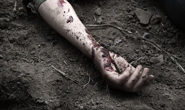 Hand of a wounded soldier on the ground