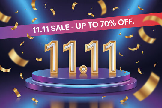 Celebrate massive savings with a dazzling 11.11 sale featuring up to 70% off, adorned with shimmering gold confetti and a dramatic spotlight for ultimate shopping excitement.