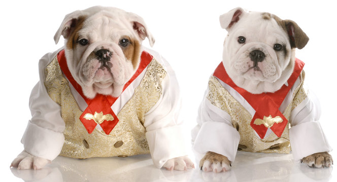 two puppies dressed in matching formal wear