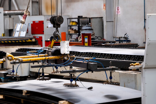 Sheet metal vacuum lifting device. Vacuum crane for lifting sheet steel, view inside the factory.