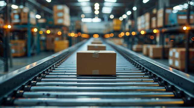 A solitary cardboard box travels along a conveyor belt, surrounded by the metal infrastructure within a modern warehouse full of shelves stocked with various goods. The focus on the package infers a s