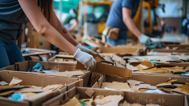 Sorting parcels on automated conveyors in large distribution center with workers in vests