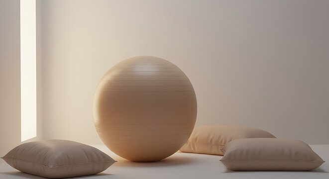 A birthing ball in a maternity room setting with soft lighting and pillows, simplified and centered on a white background, realistic and cozy,