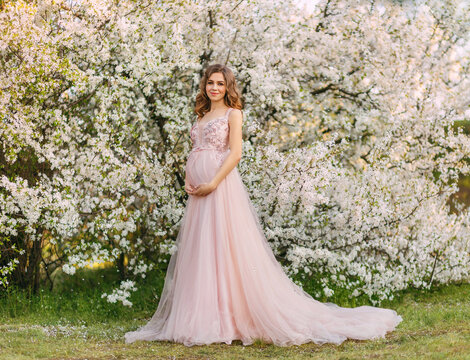 Young beautiful happy joyful pregnant woman in light pink long evening dress posing. background of blooming trees. Garden green leaves white flowers. Girl model. Elegance pregnancy spring fresh nature