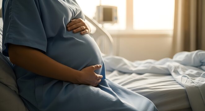 Pregnant woman in hospital gown holding her belly, sitting on a hospital bed with sunlight streaming through the window