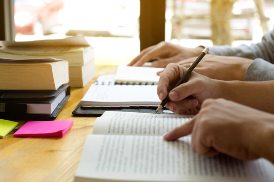 Students helps friend teaching and learning subject additional in library. using tablet to the education . Education concept.