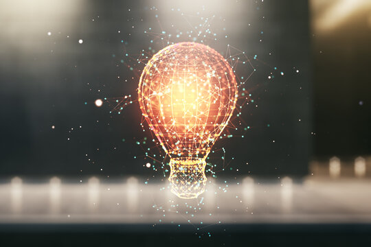 Double exposure of creative light bulb hologram on modern business center exterior background, research and development concept
