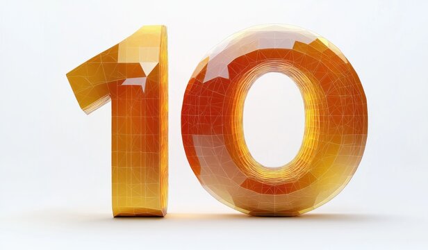 Shiny translucent golden number ten with polygon mesh overlay on a white background conveying digital and futuristic concept