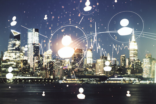 Double exposure of social network icons hologram on Manhattan office buildings background. Networking concept
