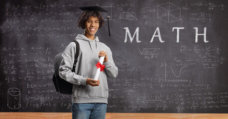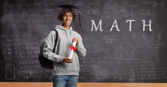 Young male student studying math at school