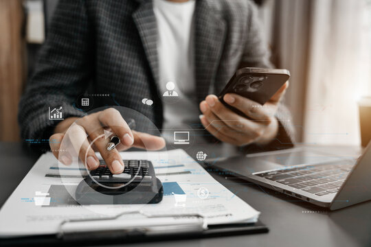 Close up Businessman using calculator and laptop for do math finance on wooden desk in office and business working background, tax, accounting, statistics and analytic research concept - Image