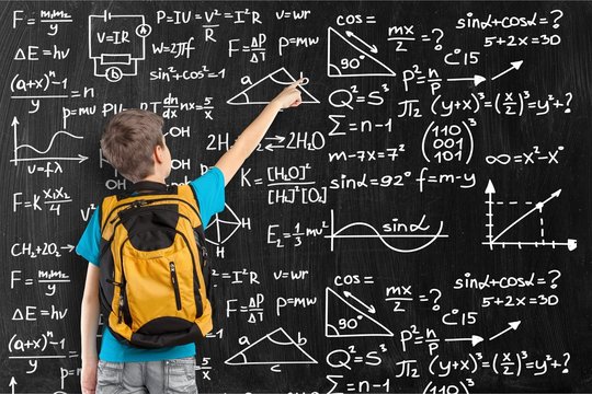 Teenage Boy showing thumb up finding idea with complicated math formulas on black board