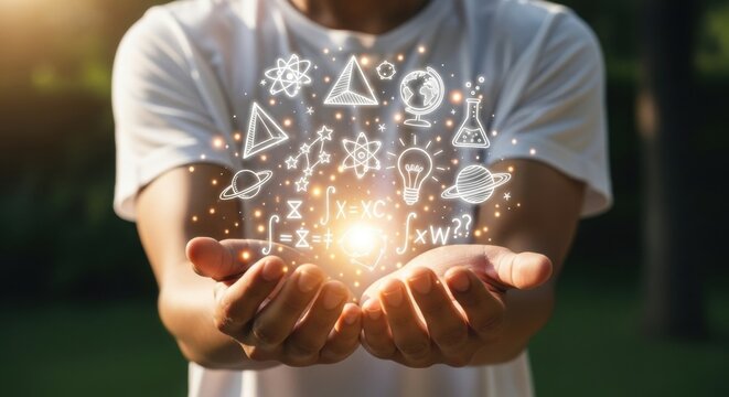 Person holding glowing science and math symbols in open hands in an outdoor setting with warm light.