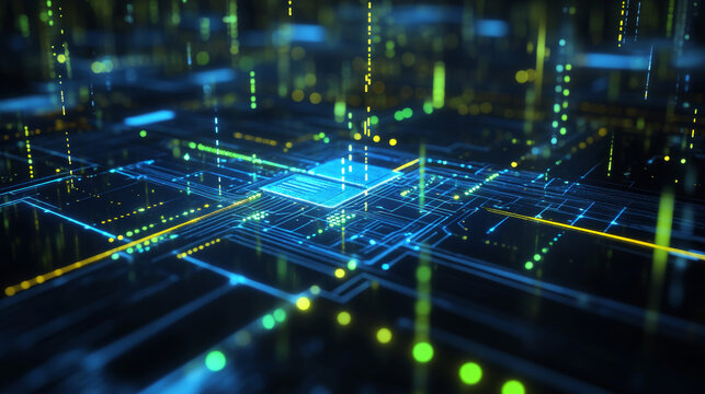 a futuristic digital cube composed of circuit boards is disintegrating emitting glowing particles against a dark matrix like background