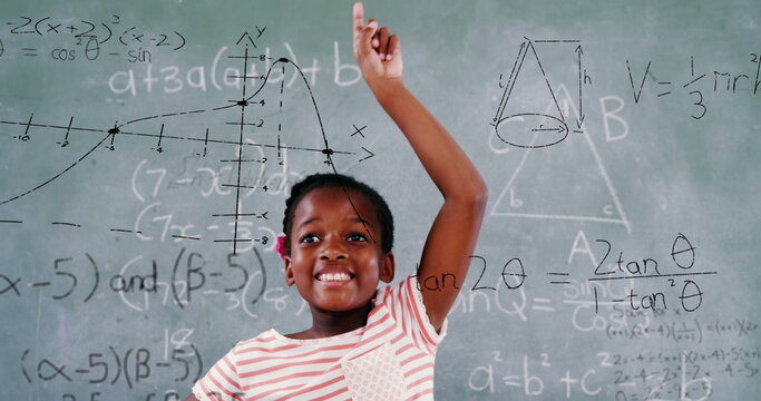 Happy biracial schoolgirl learning math enthusiastically in classroom