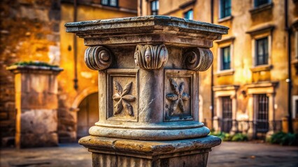 Ancient stone pedestal supports a weathered, ornate Roman numeral XXXI, symbolizing thirty-one, amidst a subtle,