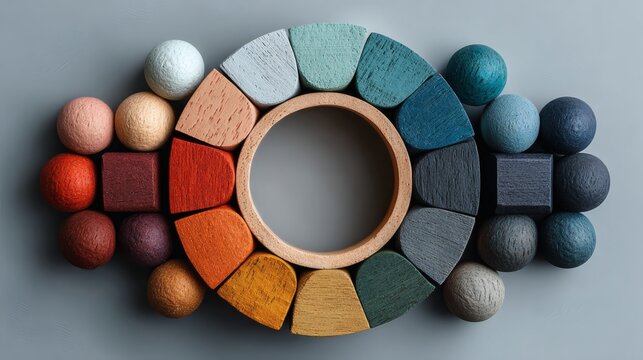 Pastel-Colored Wood Color Wheel in O Shape on White Background, Simple Minimalist Flat Design for Graphic Designers and Artists, Financial Graph Illustration with Vibrant Data Points on Blue Backgroun