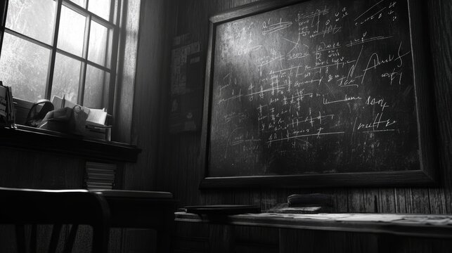 Old classroom with chalkboard filled with mathematical equations and a cozy study atmosphere in black and white