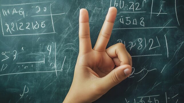 Counting Fingers: A hand showing three fingers against a chalkboard with math equations.