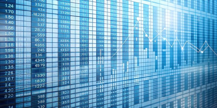 Glowing Edison bulb, blurred financial charts background, stock market data, digital display, soft focus, moody lighting, blue tones, market analysis, trading floor ambiance, technological finance con