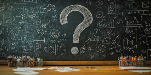 A person contemplating complex scientific and mathematical ideas on a chalkboard background