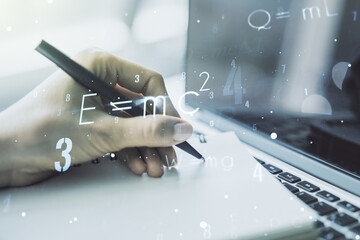 Creative scientific formula hologram with hand writing in notepad on background with laptop, research concept. Multiexposure