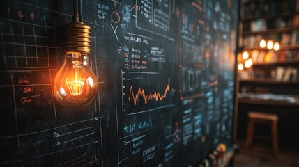 Creative Workspace with Illuminated Lightbulb and Chalkboard Covered in Mathematical Formulas