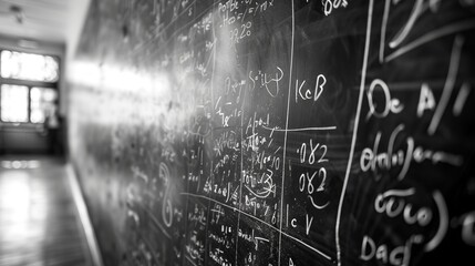 A close-up view of a chalkboard displaying numerous scientific and mathematical formulas, capturing the essence of complex thought processes and intellectual endeavors.