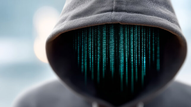 Shadowed form in binary. A hooded figure stands against a blurred background of binary code, embodying anonymity.