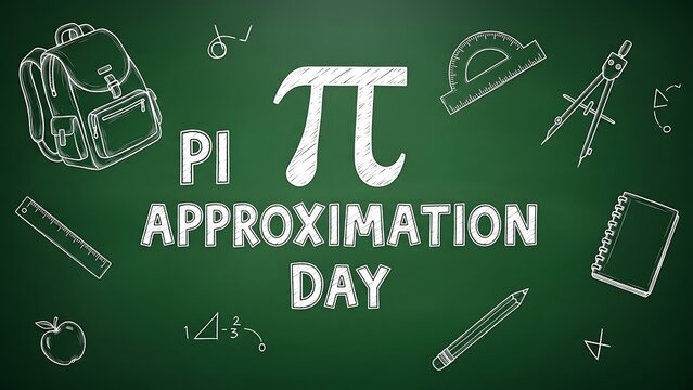 Pi Approximation Day Concept with Backpack, School Supplies, and Mathematical Drawings on a Green Chalkboard