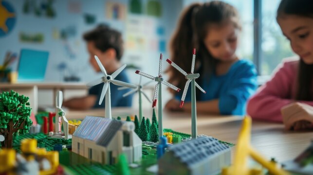 An educational STEAM lab with students constructing renewable energy models using blocks, Blocks arranged for renewable energy projects, STEAM education style