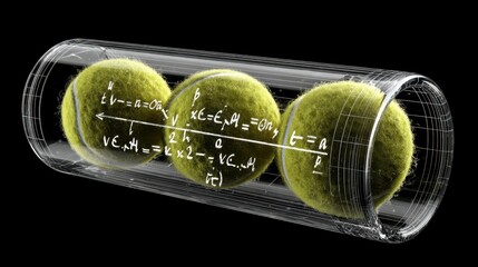 Conceptual Visualization of Green Tennis Balls in a Transparent Tube with Mathematical Formulas Illustrating Physics and Motion Dynamics