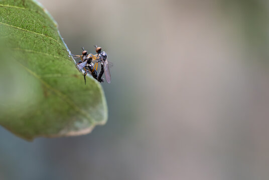 Two flies mating on a green leaf: reproduction in diptera