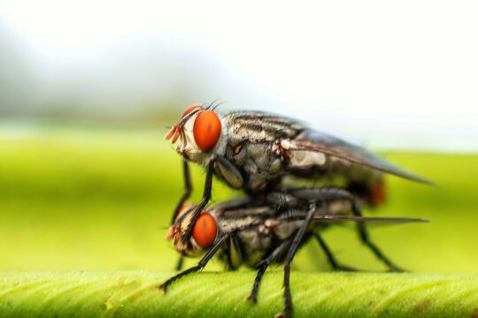 House flies (Musca domestica) are mating on a leaf. macro photography