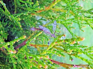 The mating process of large mosquitoes or caramores against the background of Thuja occidentalis needles. A pair of long-legged mosquitoes (Tipulidae)