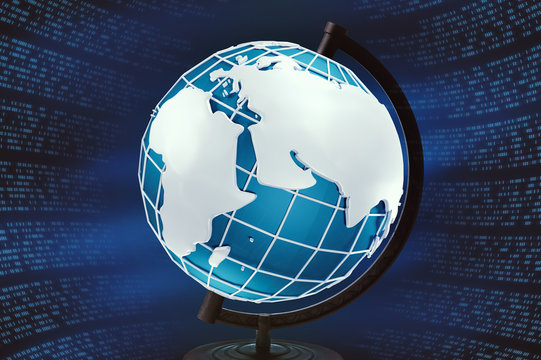 A digital globe with binary code floating around it on a dark blue and black background image
