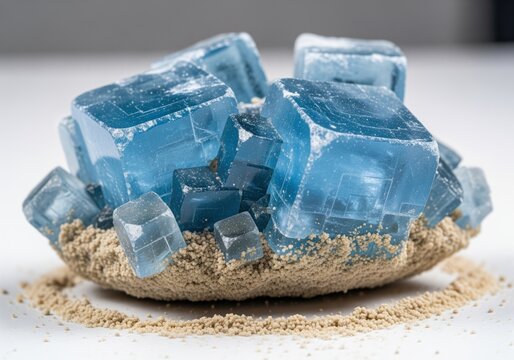 Striking cluster of translucent blue cubic crystals embedded in pale sandy matrix