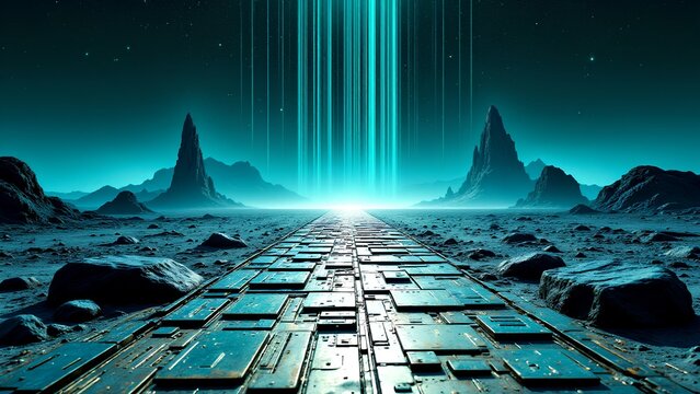 A futuristic, glowing pathway leads through a surreal, rocky landscape under a starry sky with vertical beams of light in the distance.