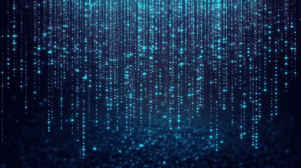 Abstract digital data stream, falling binary code, glowing particles, futuristic technology background.