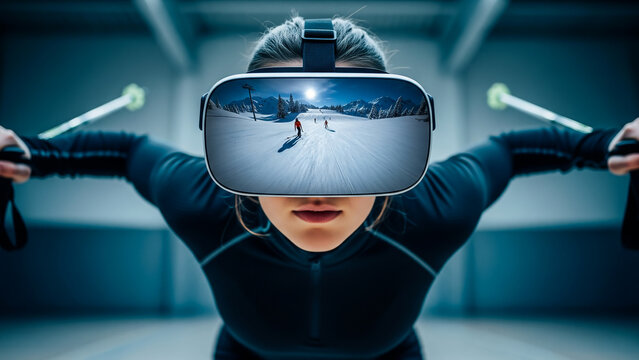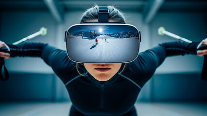VR skiing simulation with intense downhill pose and cold immersive lighting.